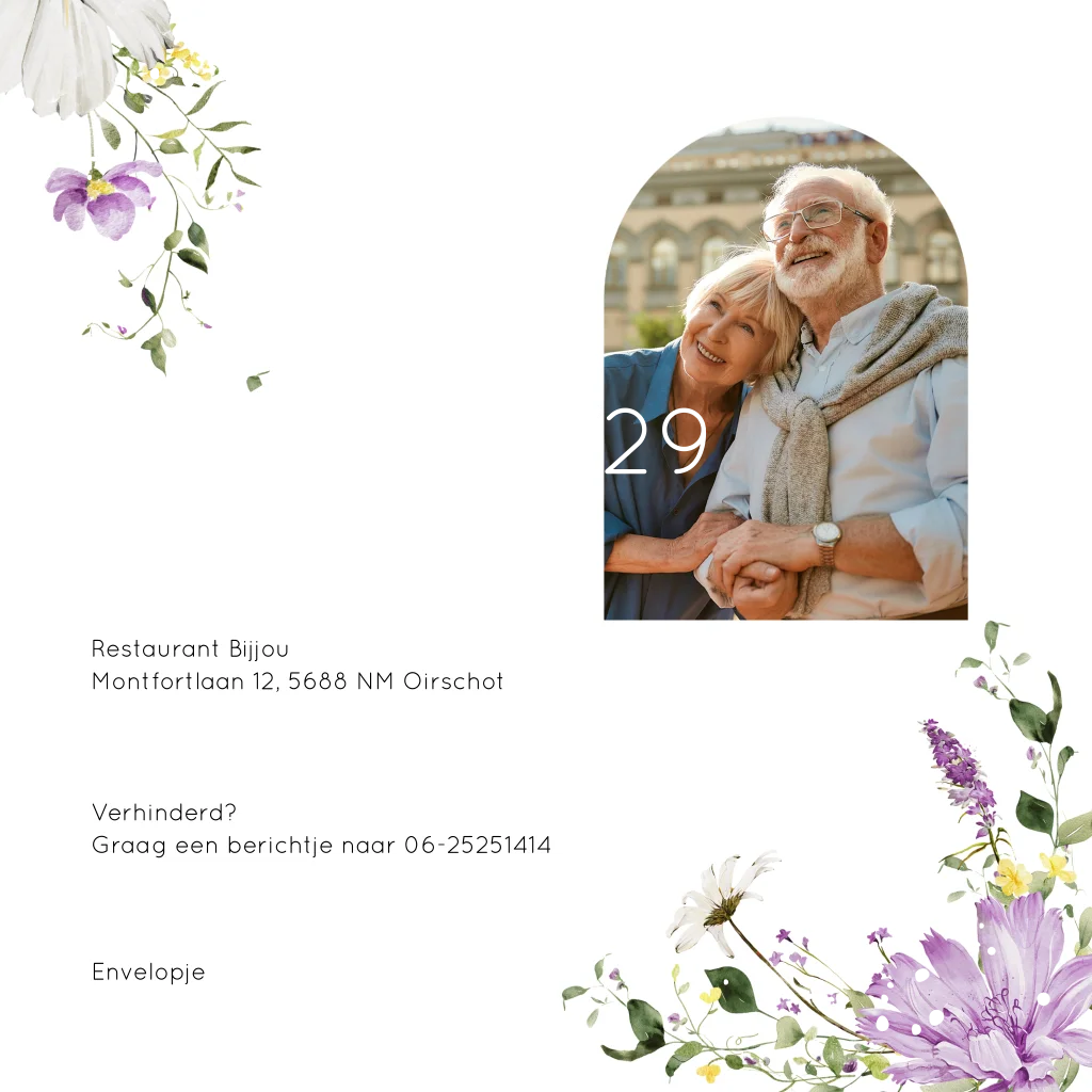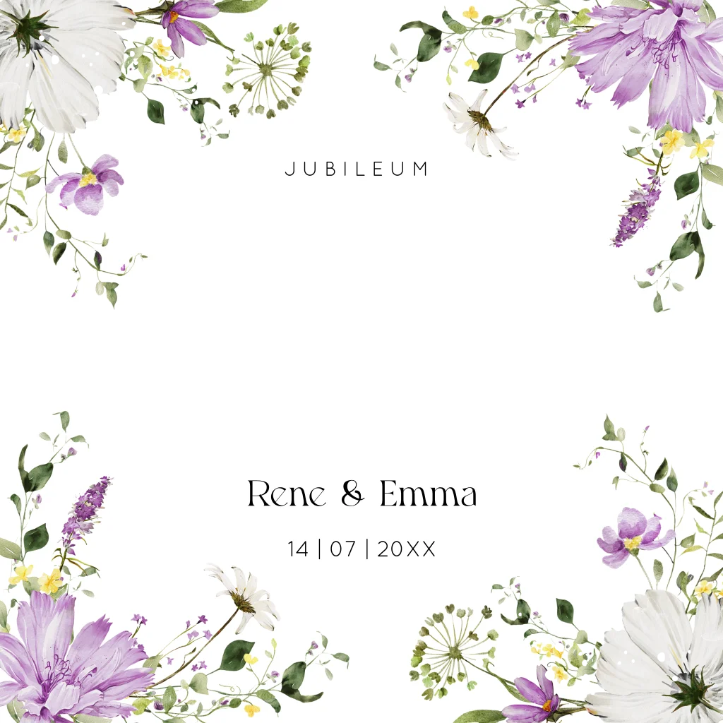 Jubileum uitnodiging 25 jaar getrouwd paars bloemen goudfolie