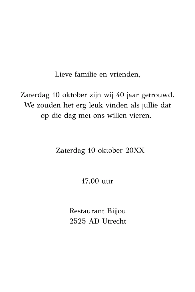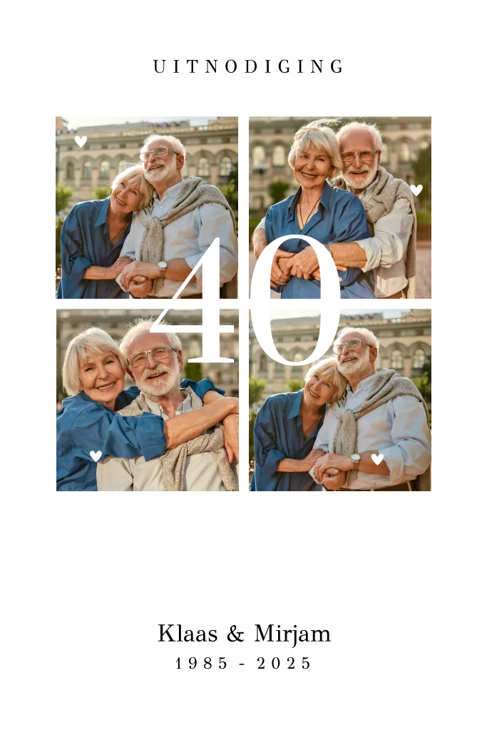 Jubileum uitnodiging 40 jaar getrouwd wit met foto 's en goudfolie.