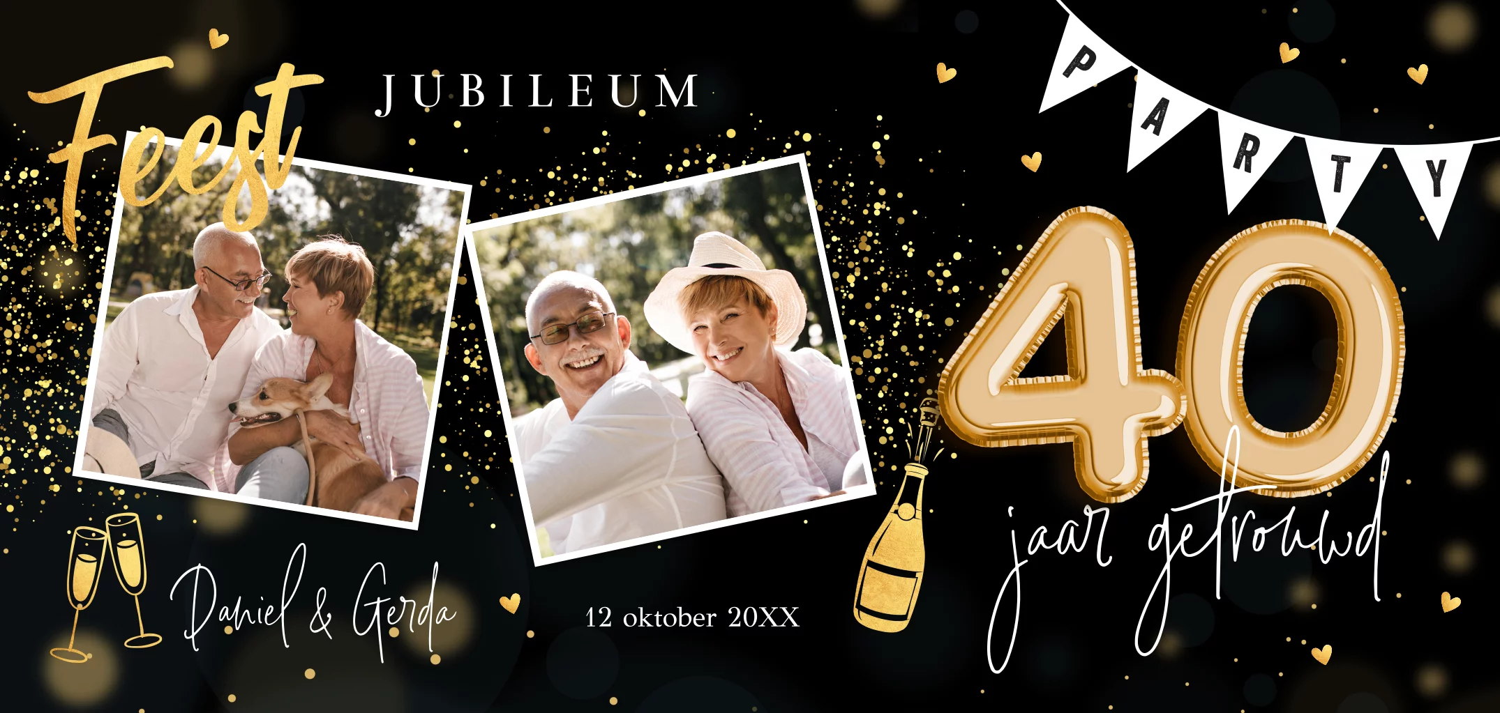 Feestelijke jubileum uitnodiging huwelijk 40 jaar getrouwd zwart met foto's, slinger, confetti en goudlook. Geen folie!