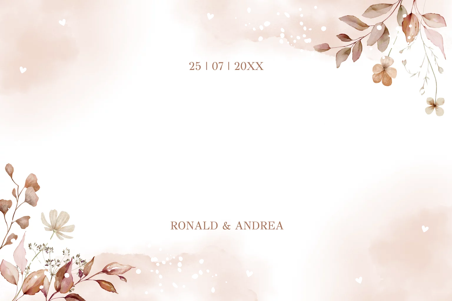 Jubileum uitnodiging 10 jaar getrouwd met foto's, beige roze watercolour bloemen en goudfolie.