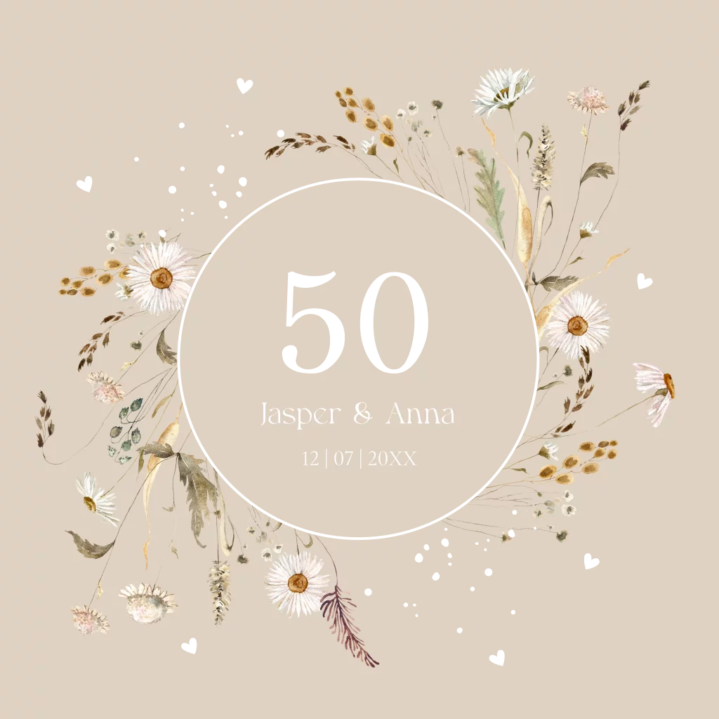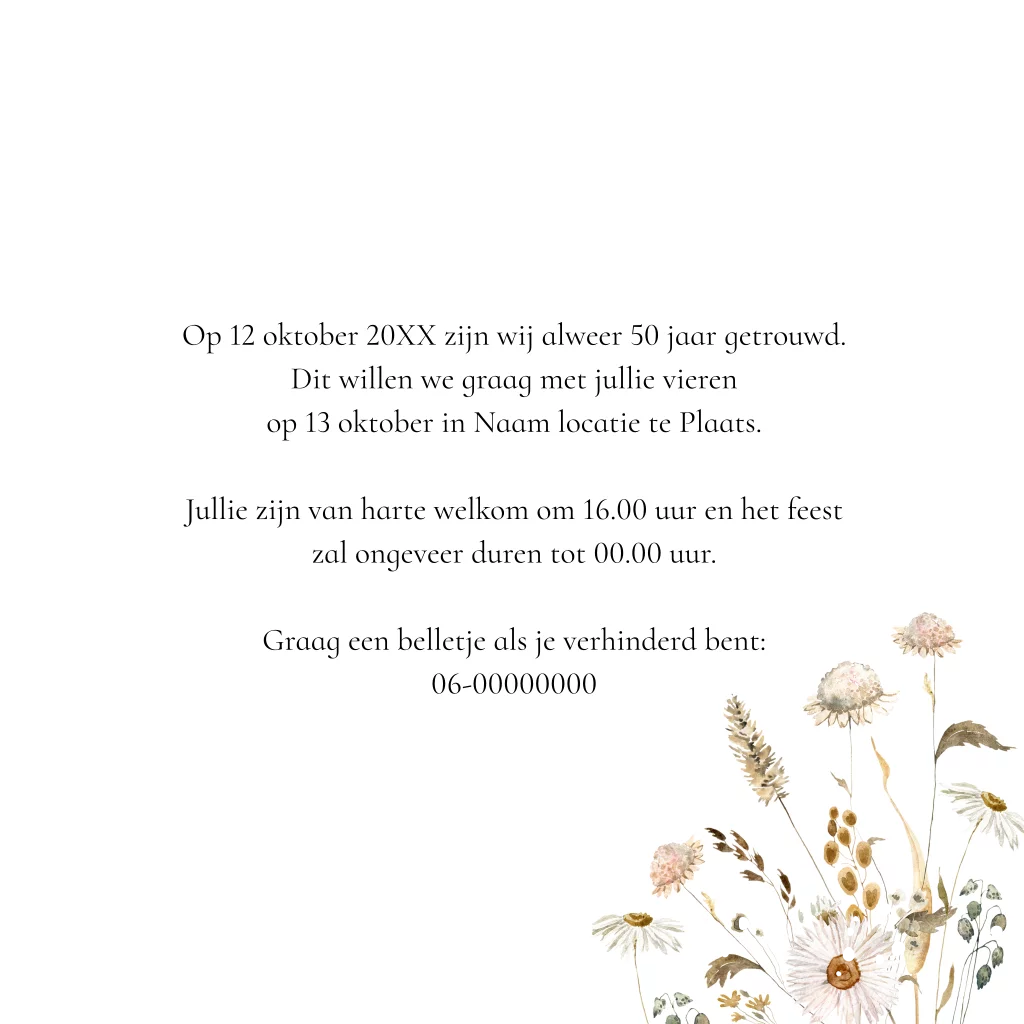 Jubileum uitnodiging 50 jaar getrouwd bloemen beige goudfolie