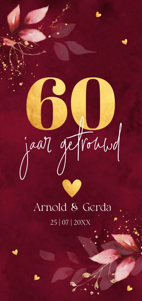 Jubileum uitnodiging huwelijk 60 jaar getrouwd rood langwerpig met botanische bladeren en goudlook. Geen folie!