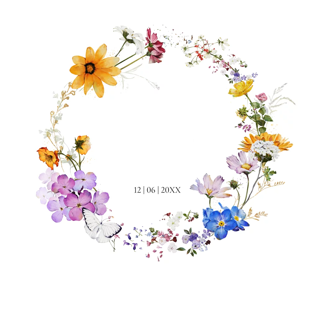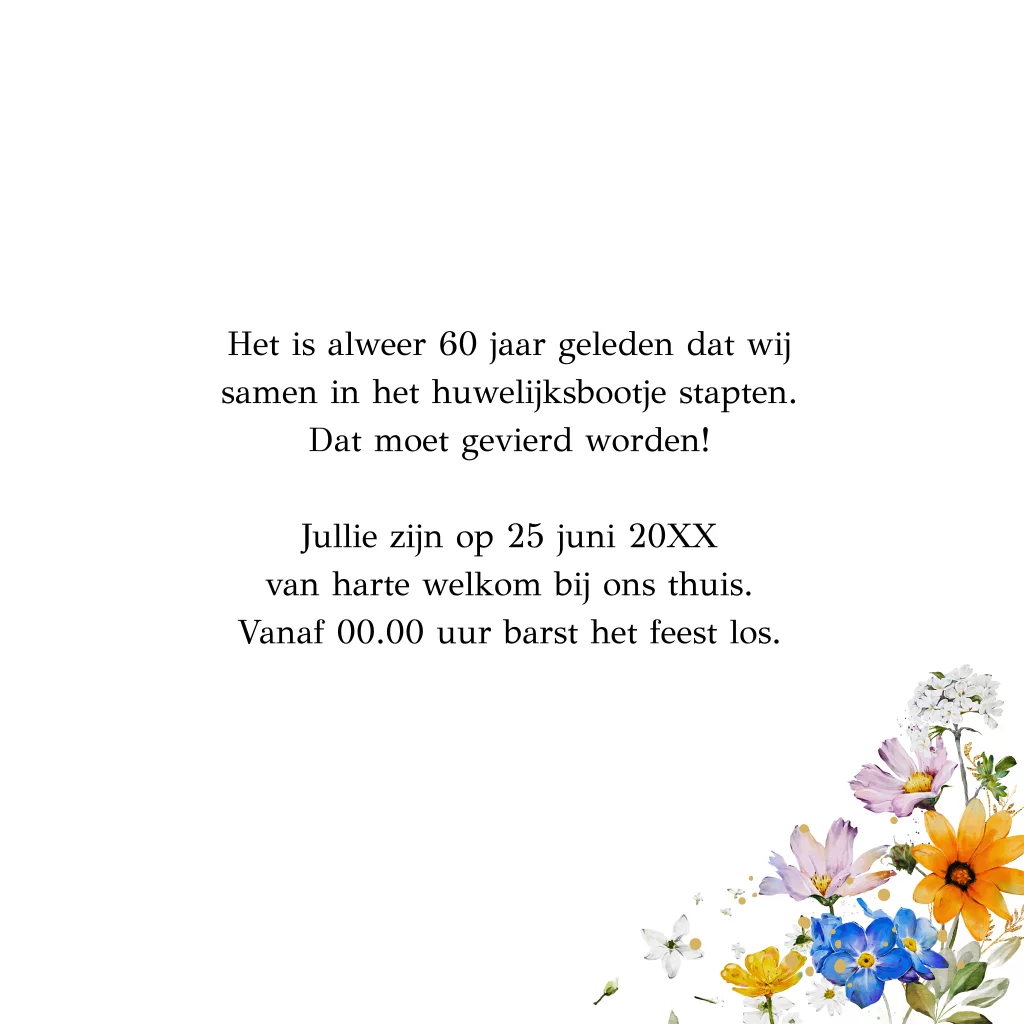 Onze prachtige jubileumuitnodiging met een zomerse bloemenkrans is de perfecte keuze voor het vieren van een 60-jarig huwelijksjubileum. De levendige paarse tint en de feestelijke bloemen zorgen voor een vrolijke en elegante uitstraling, ideaal voor een jubileumviering, of het nu een intieme bijeenkomst met familie en vrienden is of een groot feest.