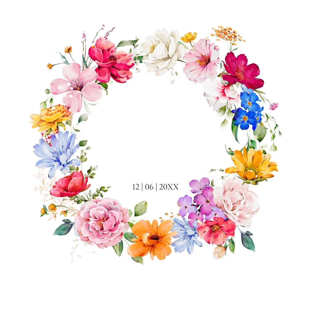 Romantische jubileum kaart uitnodiging 50 jaar getrouwd met bloemenkrans en goudfolie. In de binnenkant kan je een foto toevoegen.