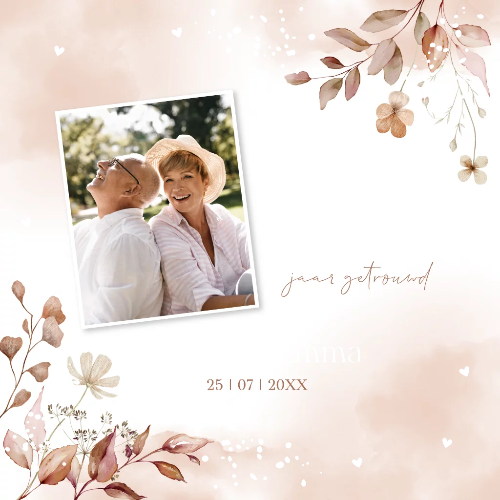 Jubileum uitnodiging met foto bloemen terracotta roze goudfolie