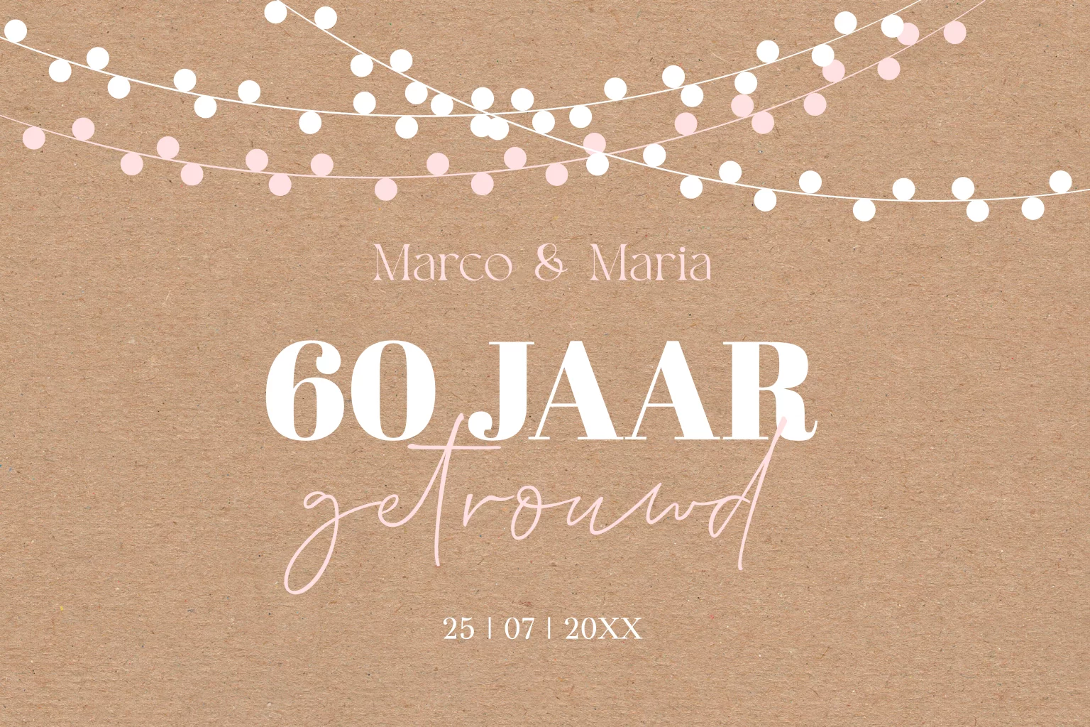 Uitnodiging jubileum huwelijk 60 jaar getrouwd bruin met slinger van lampjes en kraftlook achtergrond. Pas het jaartal naar wens aan!