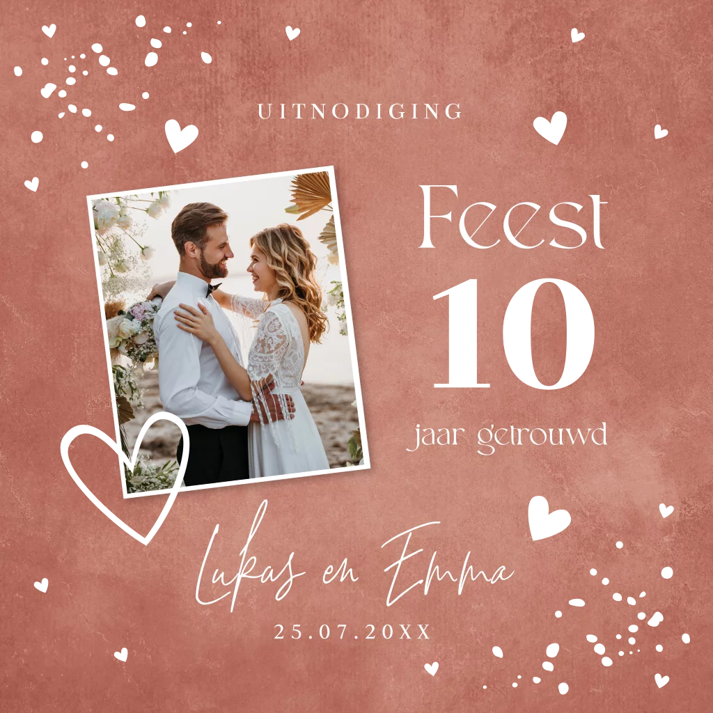 Jubileumkaart uitnodiging 10 jaar getrouwd met eigen foto, terracotta kleur, hartjes en goudfolie. Pas het getal naar wens aan!