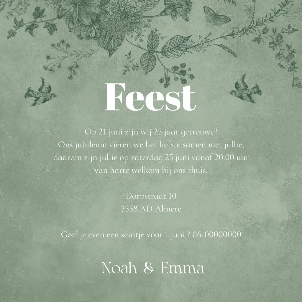 Uitnodiging huwelijk jubileum kaart groen met 25 jaar getrouwd en botanische bloemen.