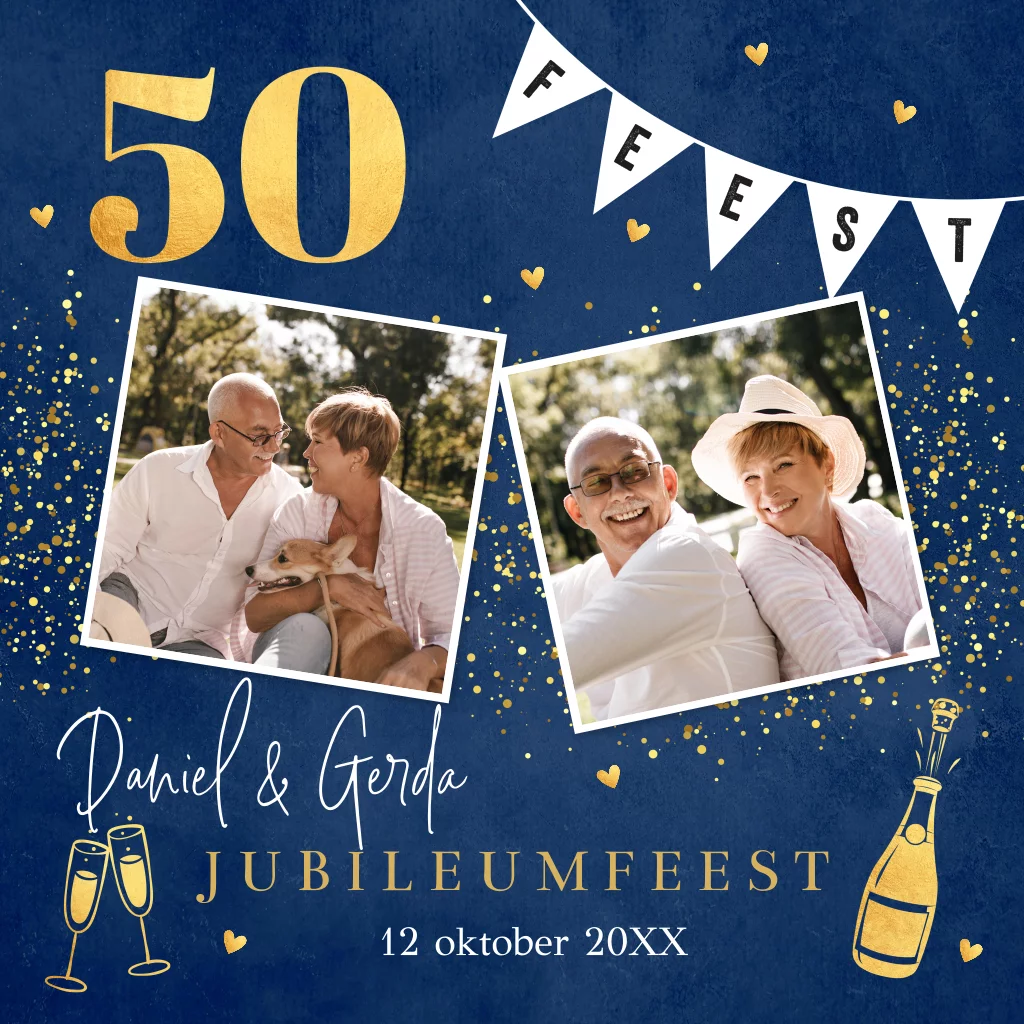 Uitnodiging jubileum huwelijk kaart donkerblauw met eigen foto's, tekst 50 jaar getrouwd en goudlook. Geen folie!