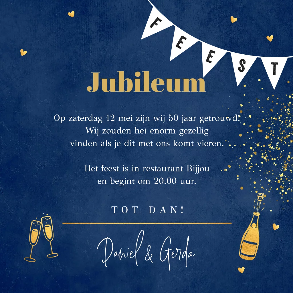 Uitnodiging jubileum huwelijk 50 jaar getrouwd blauw foto goudlook