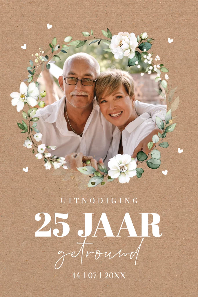 Jubileum uitnodiging met foto bloemenkrans kraft 25 jaar getrouwd