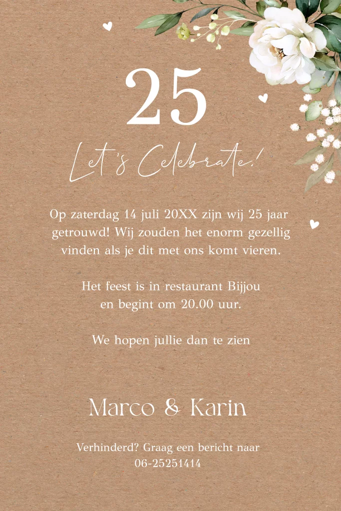 Jubileumkaart uitnodiging 25 jaar getrouwd met foto, bloemenkrans en kraftlook bruin.