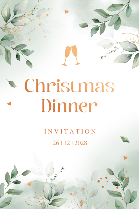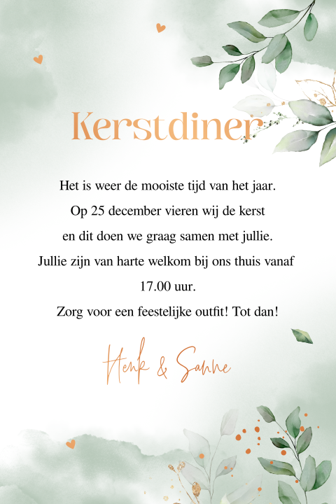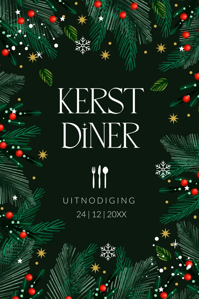 Kerstdiner uitnodiging groen botanisch met kersttakjes en goudfolie. Nodig je gasten in stijl uit met deze prachtige kerst uitnodiging!