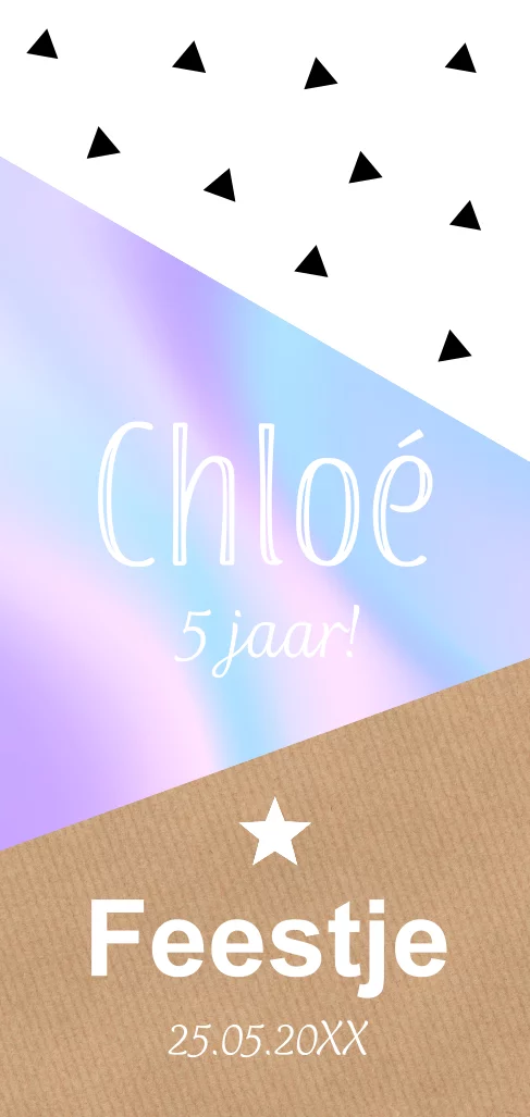 Uitnodiging kinderfeestje voor een meisje met geometrische vlakken, holografische print, kraft en driehoekjes.