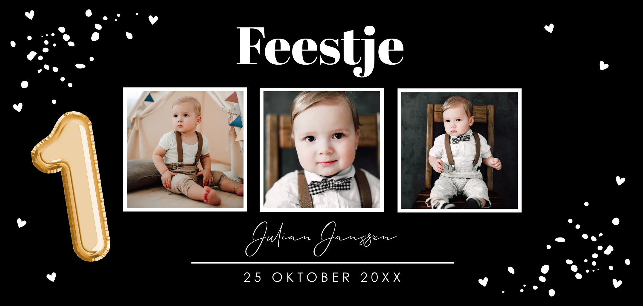Uitnodiging kinderfeestje voor een jongen of meisje 1 jaar met zwart goud, fotocollage en goudfolie.