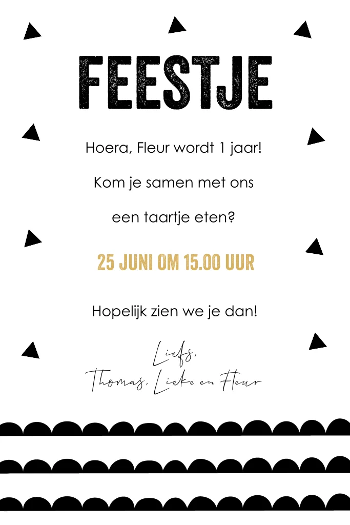 Uitnodiging kinderfeestje met foto en driehoekjes.