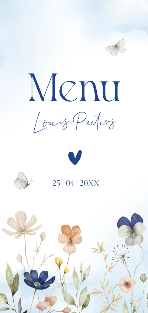 Menukaart communie bloemen blauw jongen vlinders