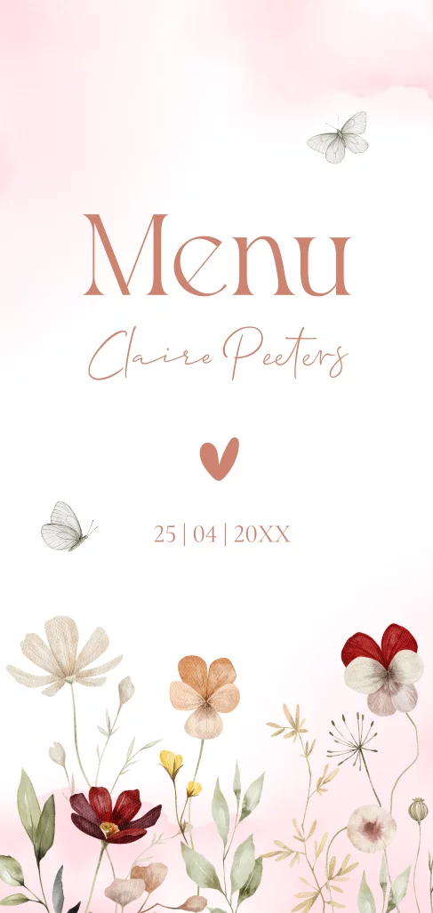 Menukaart communie langwerpig met bloemen terraroze en vlinders.