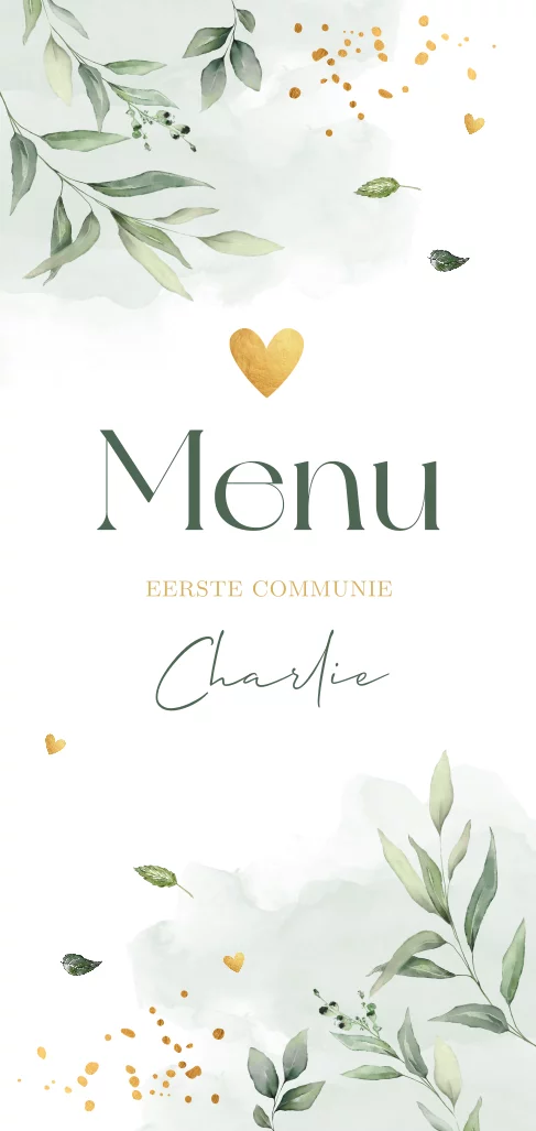 Menukaart communie langwerpig botanisch met watercolour en bladeren.