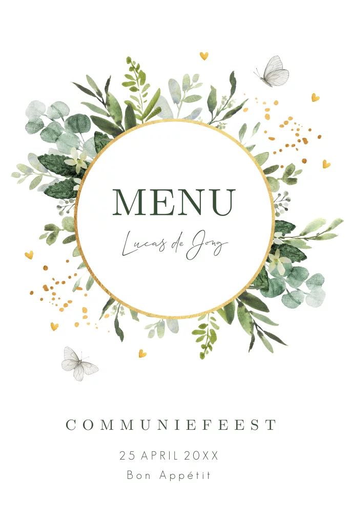 Menukaart communie met botanisch groene bladeren en goudlook spetters. Geen folie!