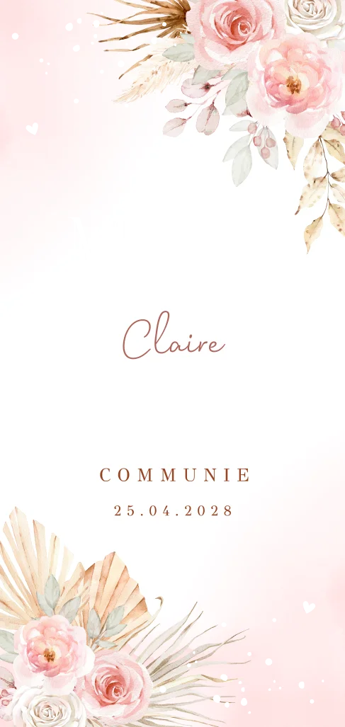 Menukaart communie voor een meisje met bohemian roze bloemen en goudfolie.