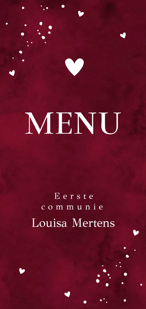 Onze prachtige langwerpige menukaart in diep rood met speelse spetters en glinsterend goudfolie is een chique en stijlvolle keuze voor de communie van jouw kind. De klassieke en trendy uitnodigingskaart straalt elegantie uit en is perfect voor een feestelijke gelegenheid.