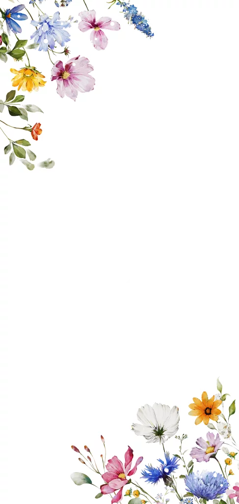 Menukaart langwerpig communie wit met zomerse bloemen en goudfolie.