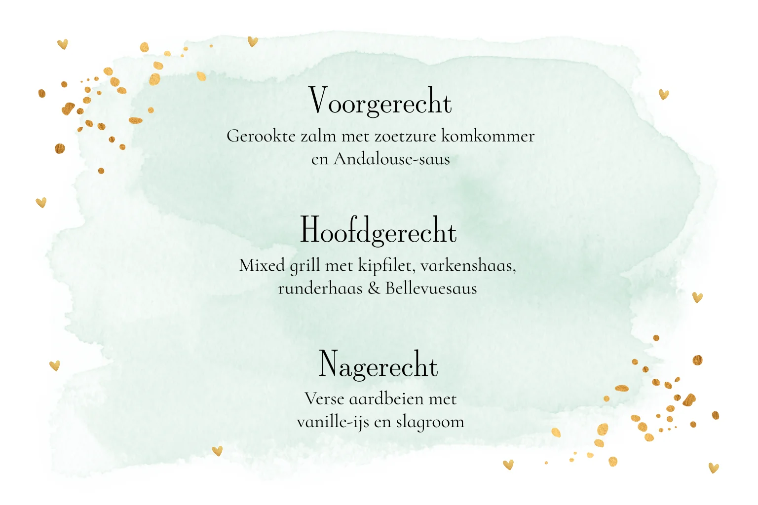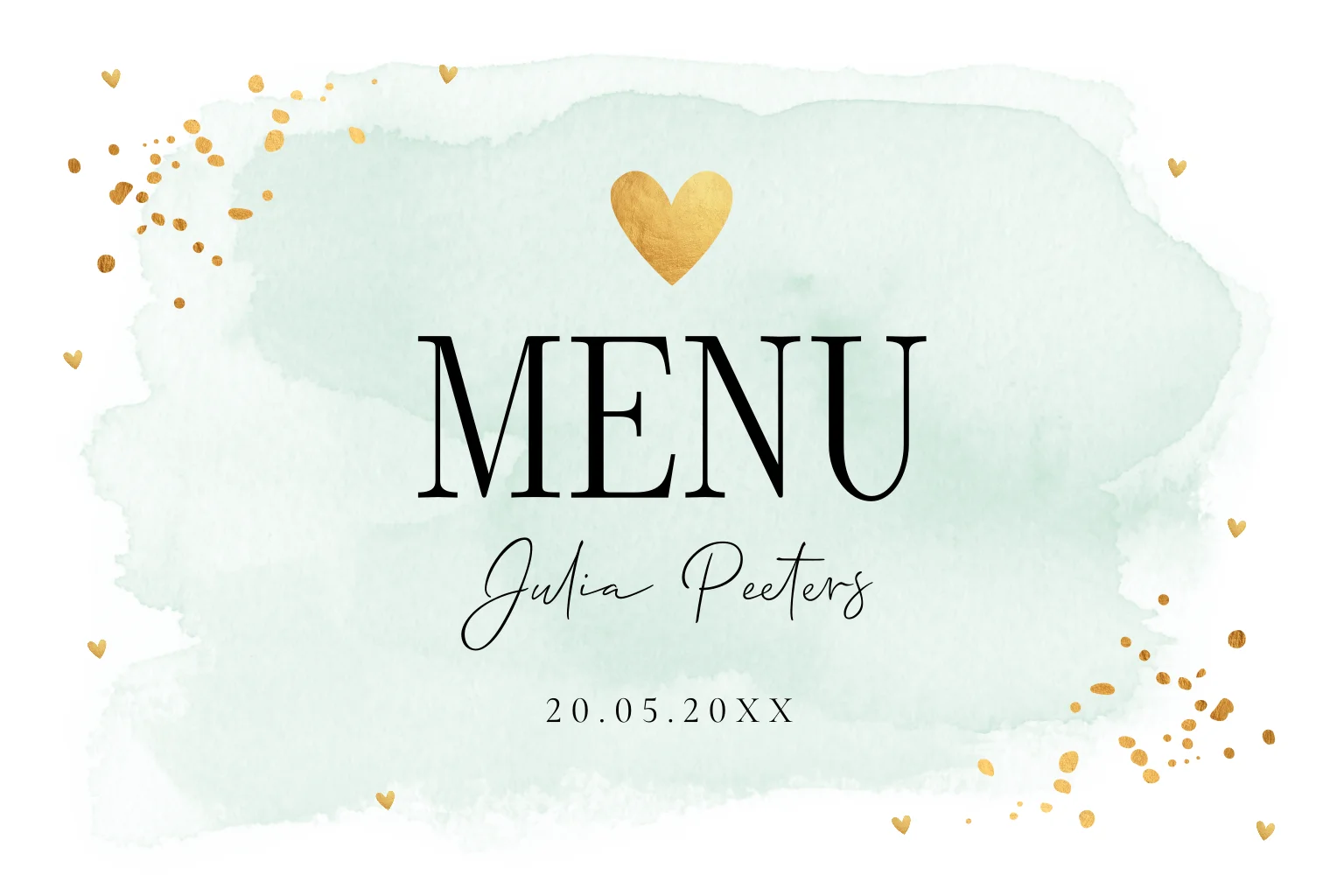 Menukaart waterverf mintgroen met goudlook confetti.