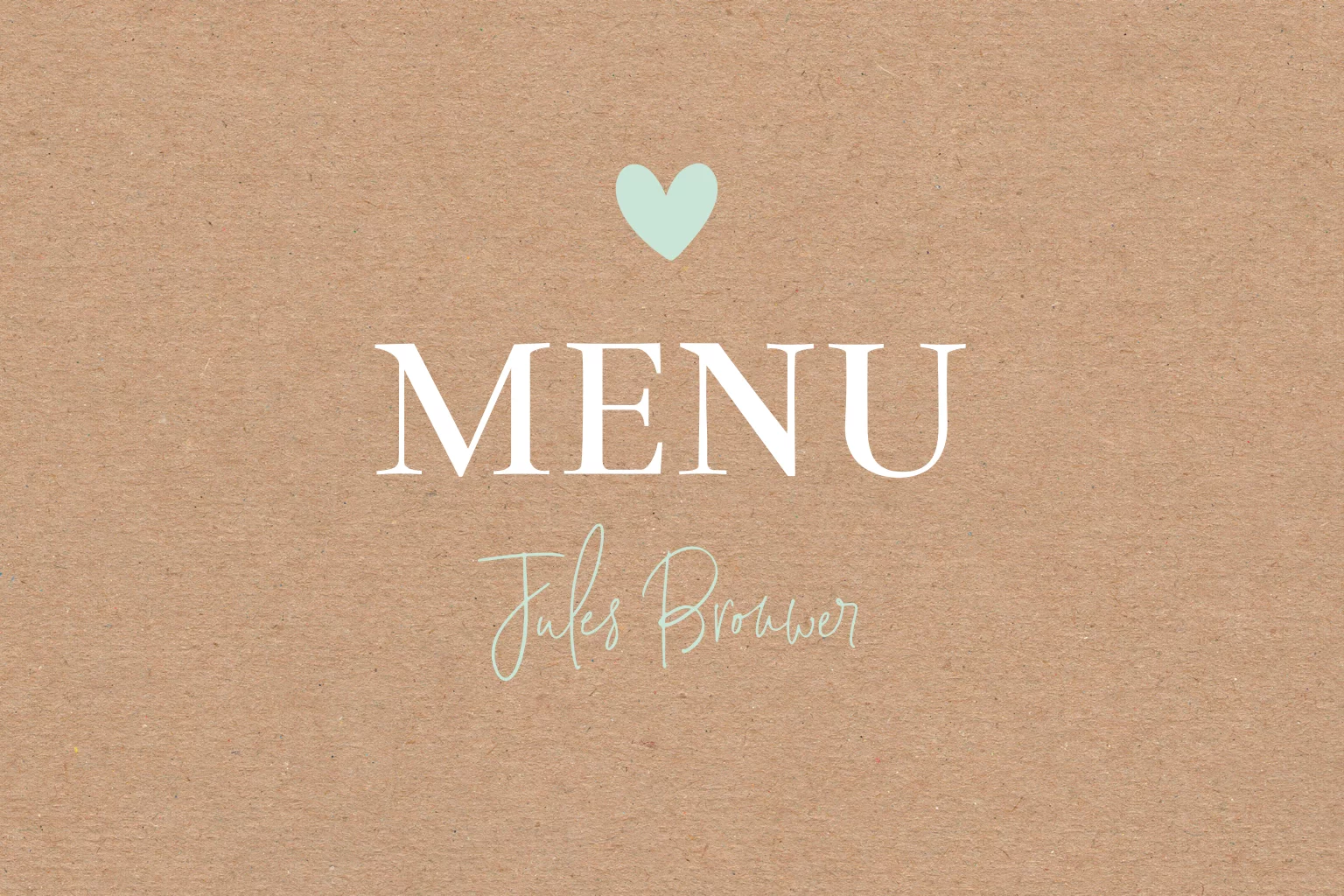 Menukaart communie met hartje mintgroen en kraftlook achtergrond.