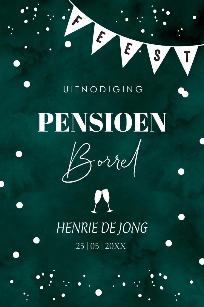 Pensioen uitnodiging feest groen met goudfolie, slinger en confetti.