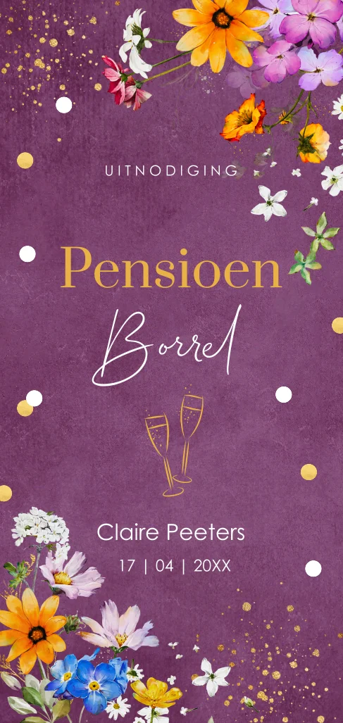 Pensioen uitnodiging borrel vrouw bloemen paars
