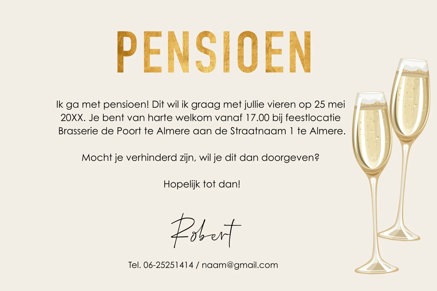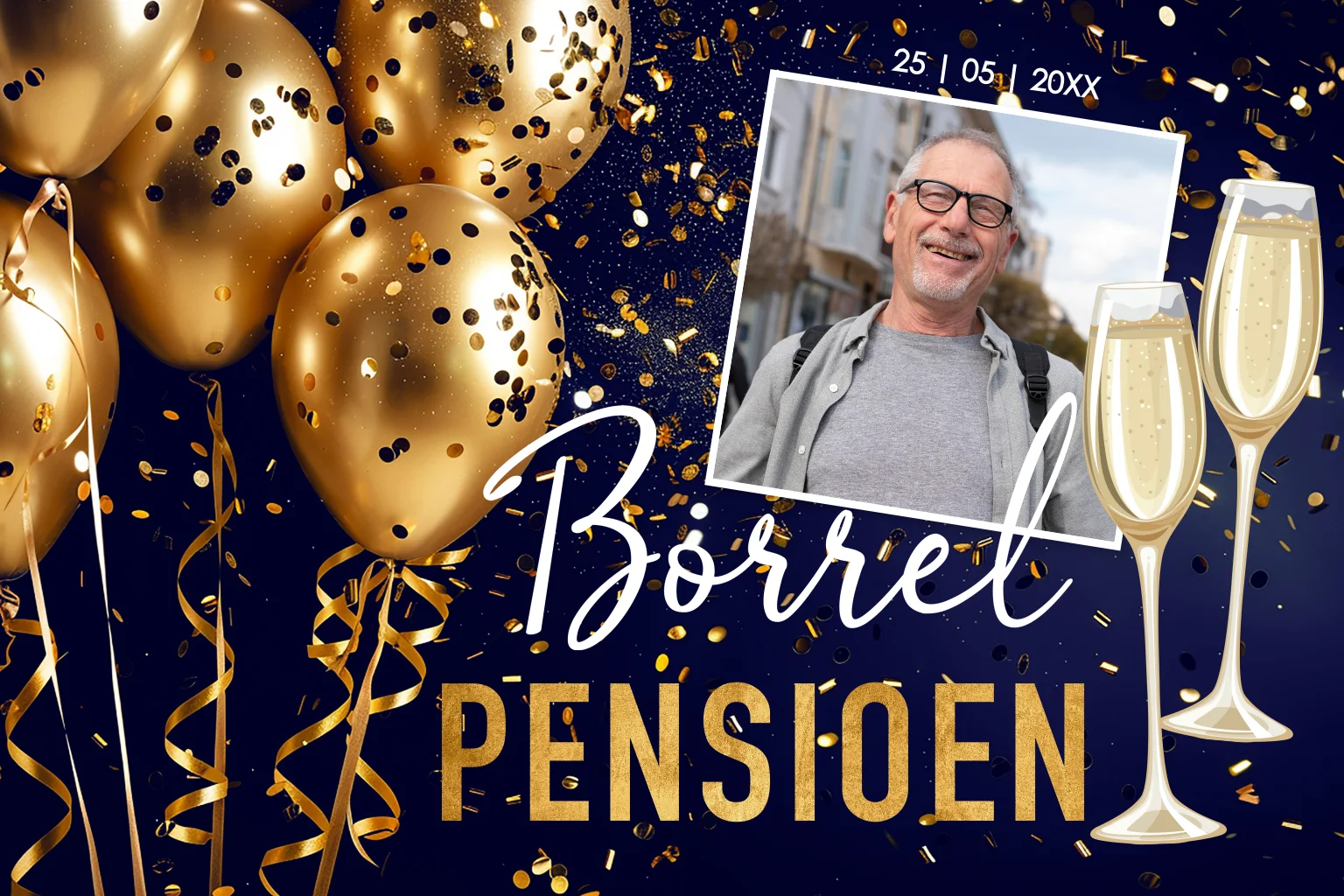 Feestelijke pensioen uitnodiging blauw met ballonnen goudlook, champagneglazen en eigen foto.