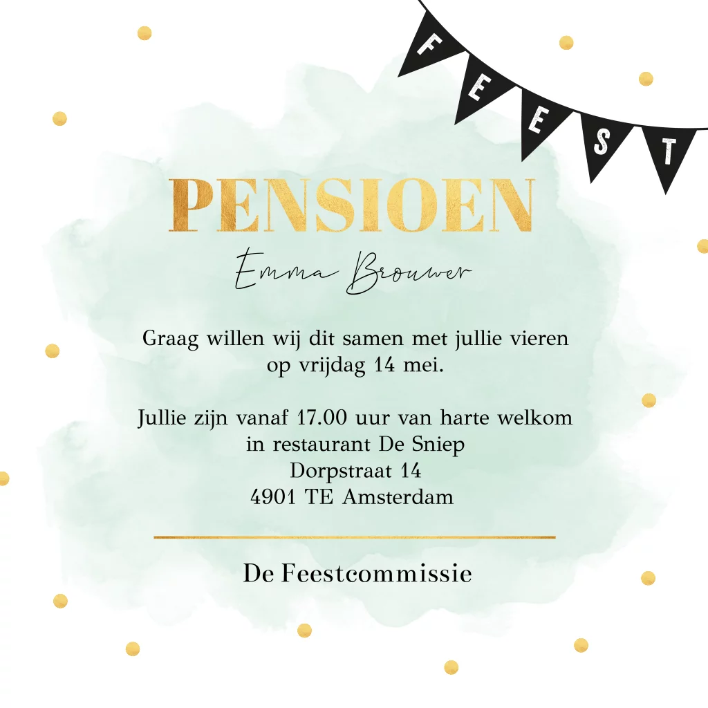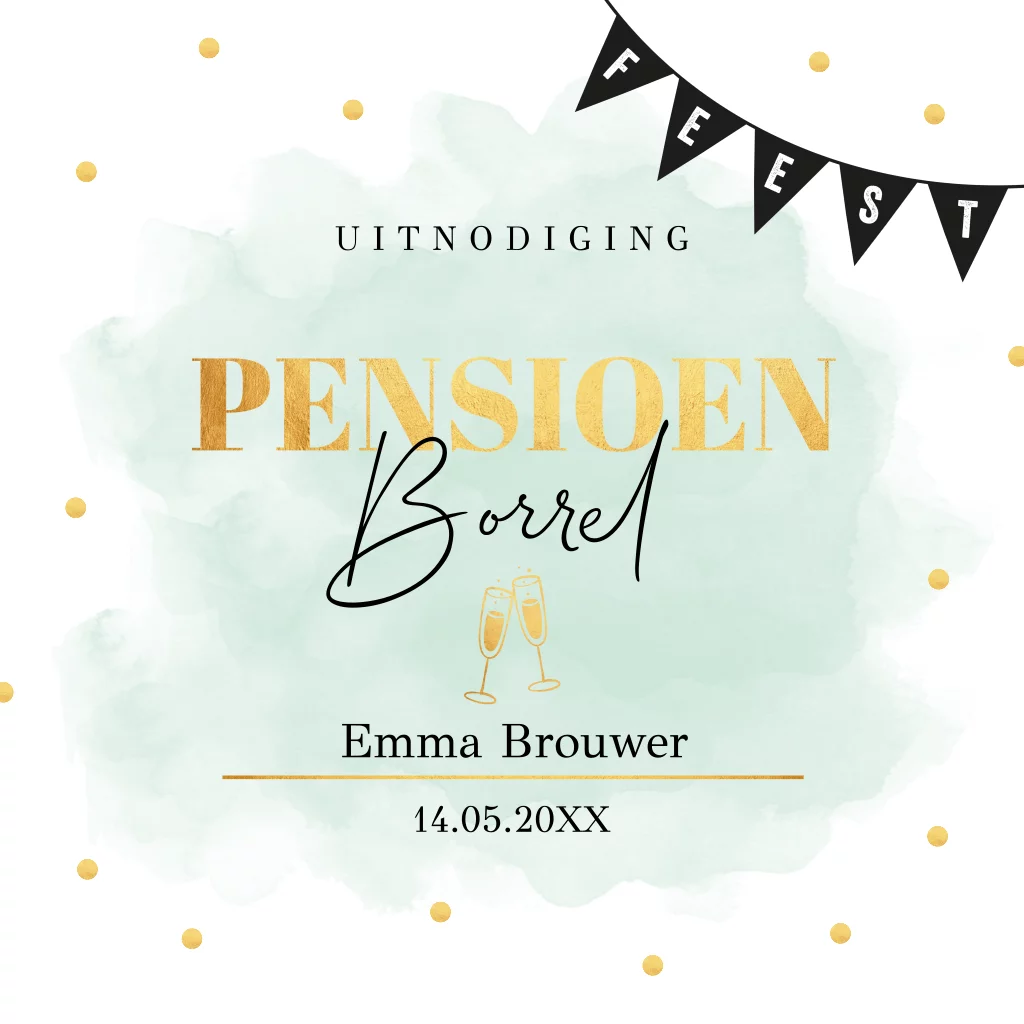 Pensioenkaart met watercolour mintgroen en goudlook spetters. Geen folie! Pas de kleuren naar wens aan.