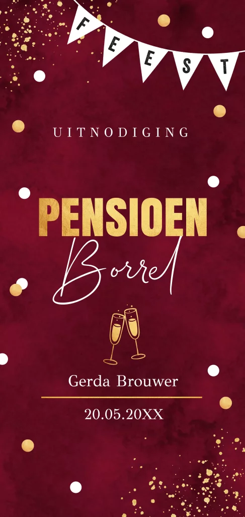 Pensioen uitnodiging langwerpig rood met goudlook (geen folie) spetters en champagneglazen. Nodig je gasten uit met deze feestelijke pensioenkaart!