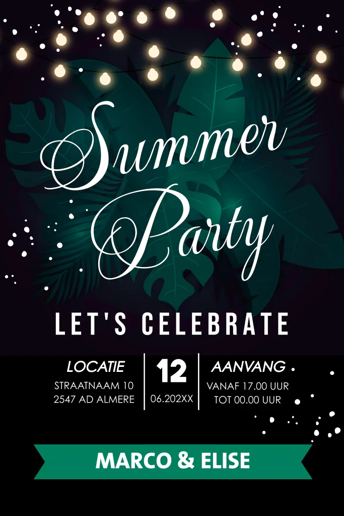 Summer Party uitnodiging groen zwart met lampjes, botanisch neon bladeren en goudfolie.