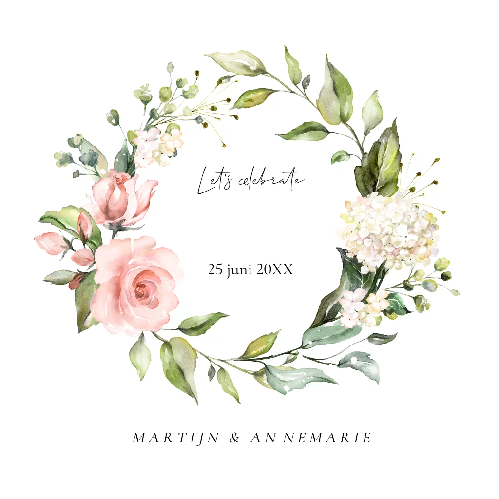 Tuinfeest uitnodiging met bloemenkrans, groene bladeren en goudfolie.