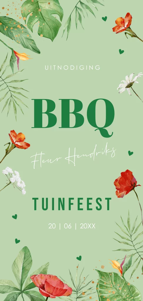 Tuinfeest uitnodiging langwerpig groen met tropische bladeren. Vier je verjaardag met deze zomerse uitnodiging!