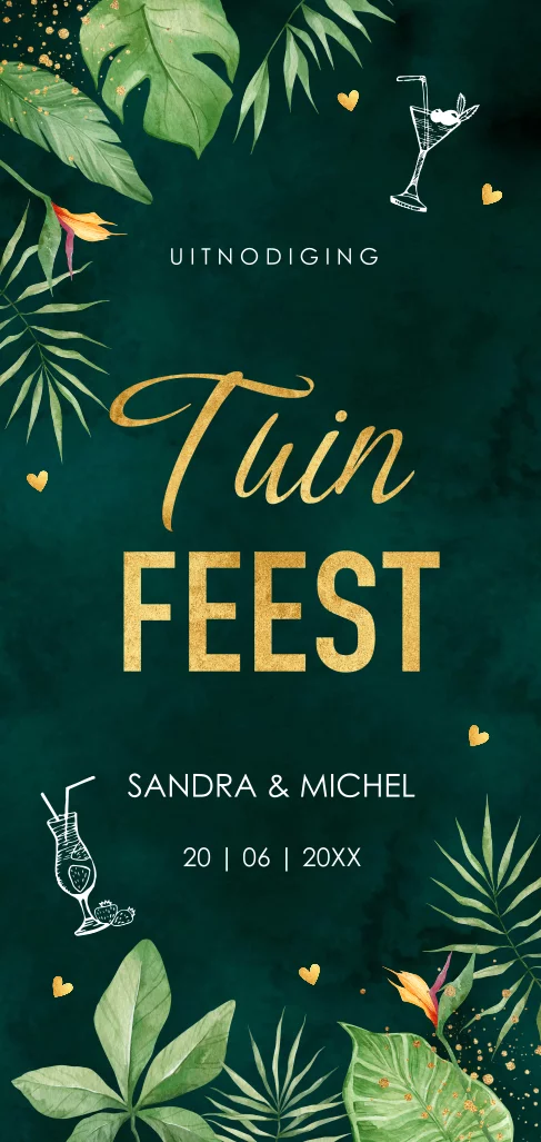 Tuinfeest uitnodiging groen langwerpig voor een verjaardag met tropische bladeren, cocktails en goudlook. Geen folie!