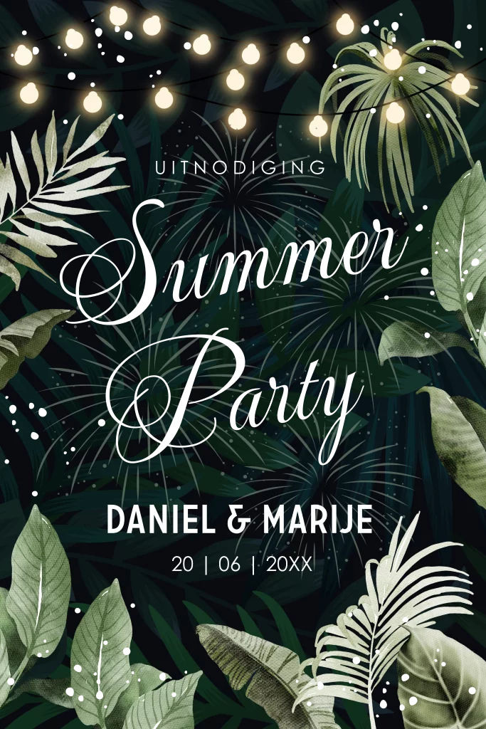 Zomerse uitnodiging voor een tuinfeest met groene tropische bladeren, lampjes en goudfolie.