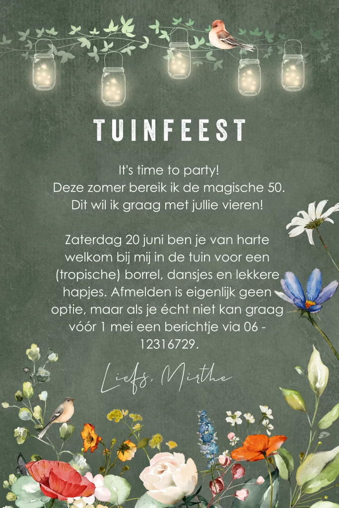 Verjaardagsuitnodiging tuinfeest voor een vrouw groen met houten wegwijzer, bloemen, vogels en lampjes.