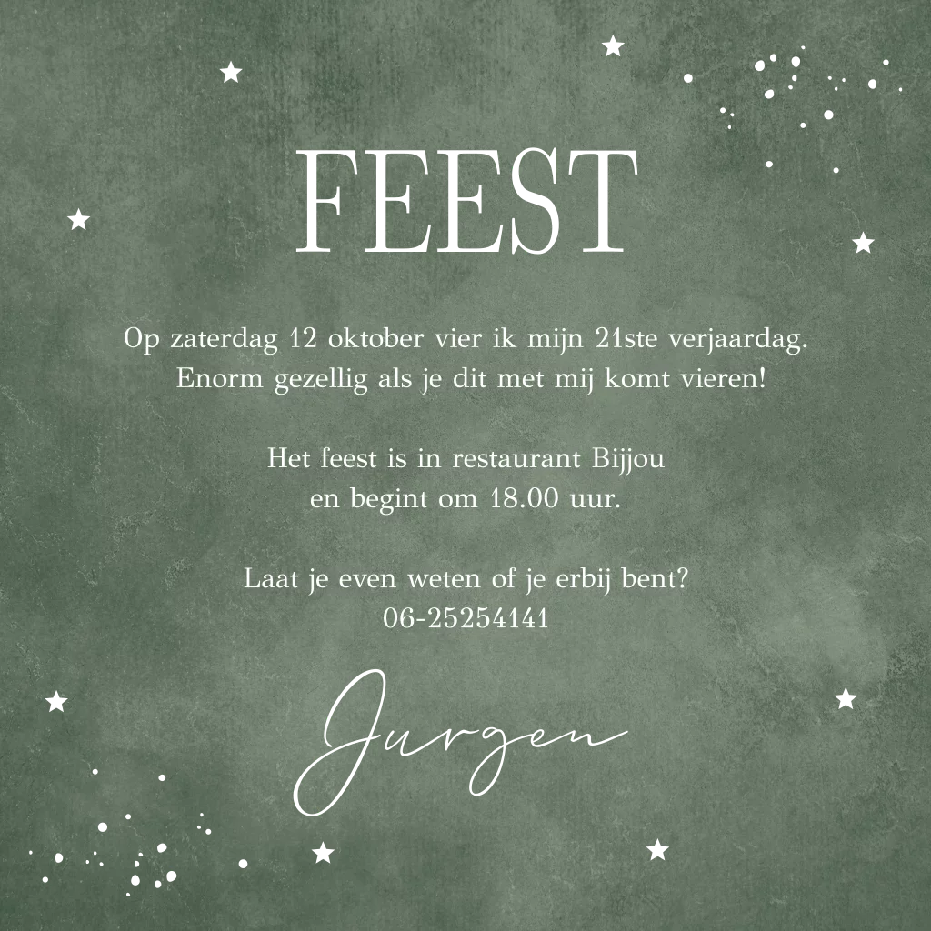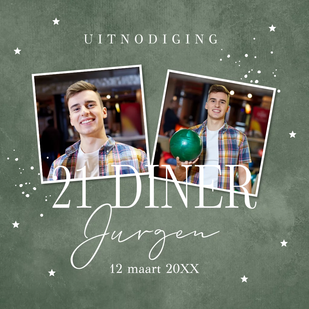 Uitnodiging 21 diner verjaardag groen met foto's groen en goudfolie.