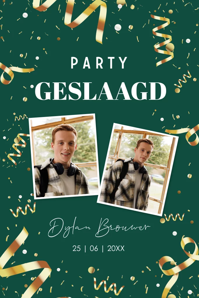 Feestelijke uitnodiging geslaagd voor een jongen groen met foto 's, slingers en confetti.
