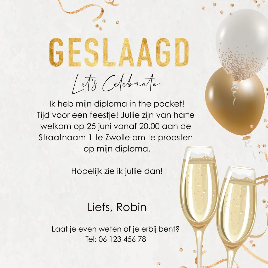 Uitnodiging geslaagd ballonnen confetti goudlook
