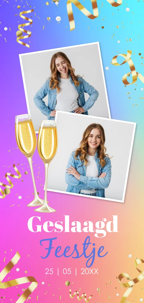 Uitnodiging geslaagd feestje examen diploma langwerpig vrouw holografisch met eigen foto's en champagneglazen.