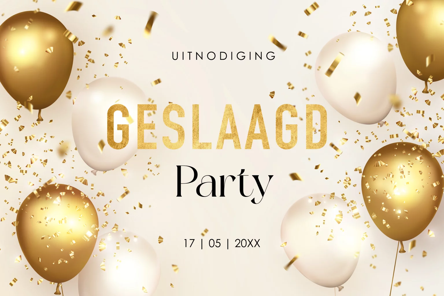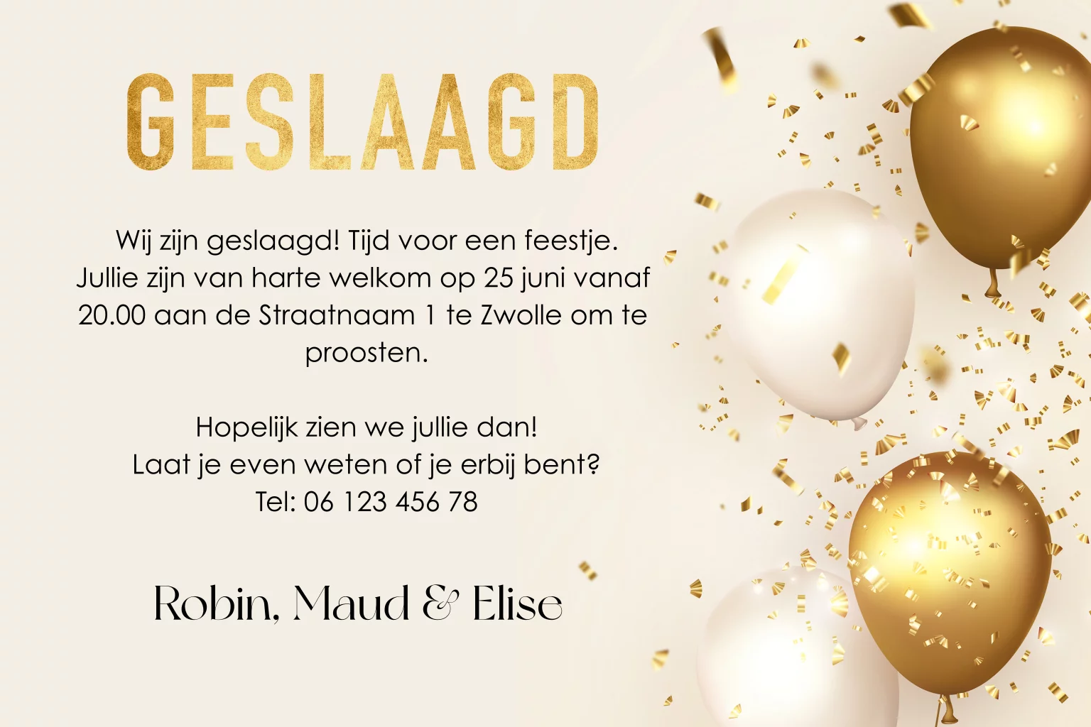 Uitnodiging geslaagd examen feest met goud kleurige ballonnen.