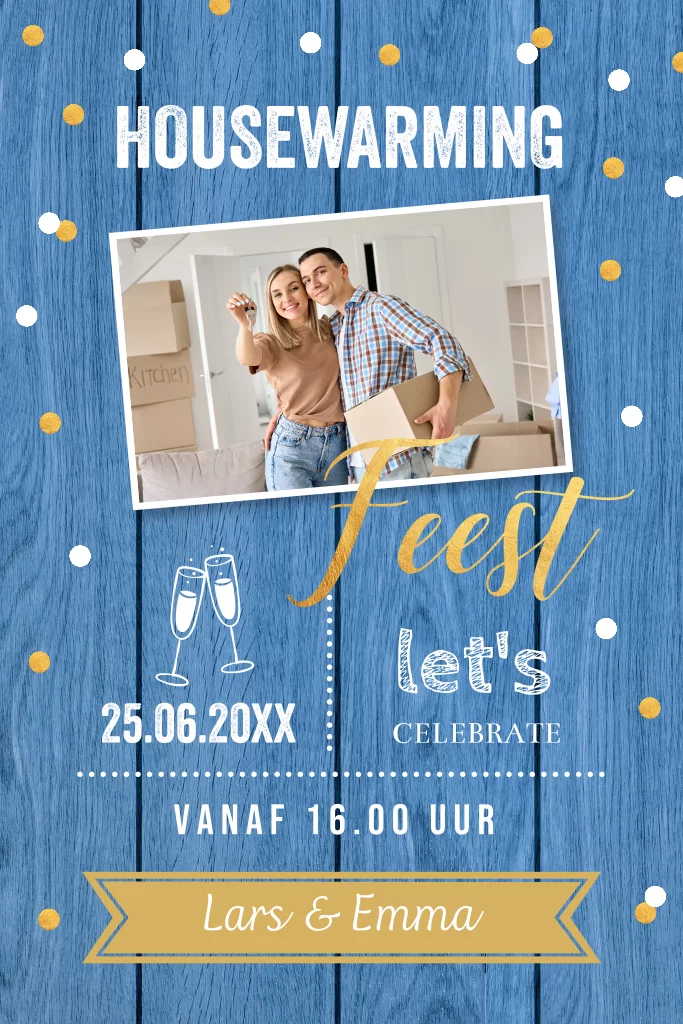 Uitnodiging housewarming feest blauw hout print met foto en confetti. Nodig je gasten uit met deze feestelijke housewarming kaart!