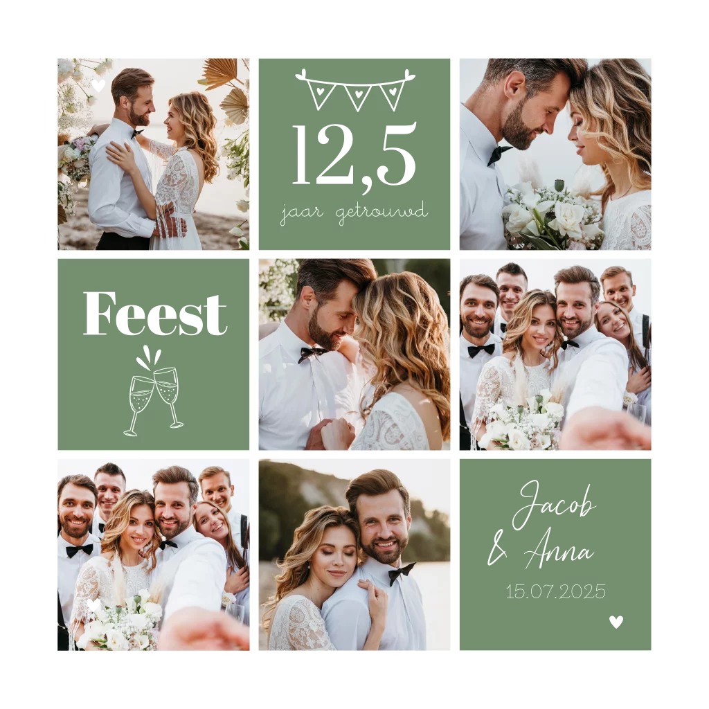 Uitnodiging jubileum 12 5 jaar getrouwd fotocollage groen goudfolie