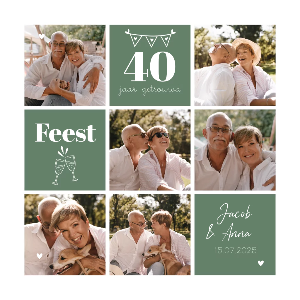 Uitnodiging jubileum robijnen huwelijk 40 jaar getrouwd met gekleurde groene vlakken, eigen foto's (fotocollage) en goudfolie.