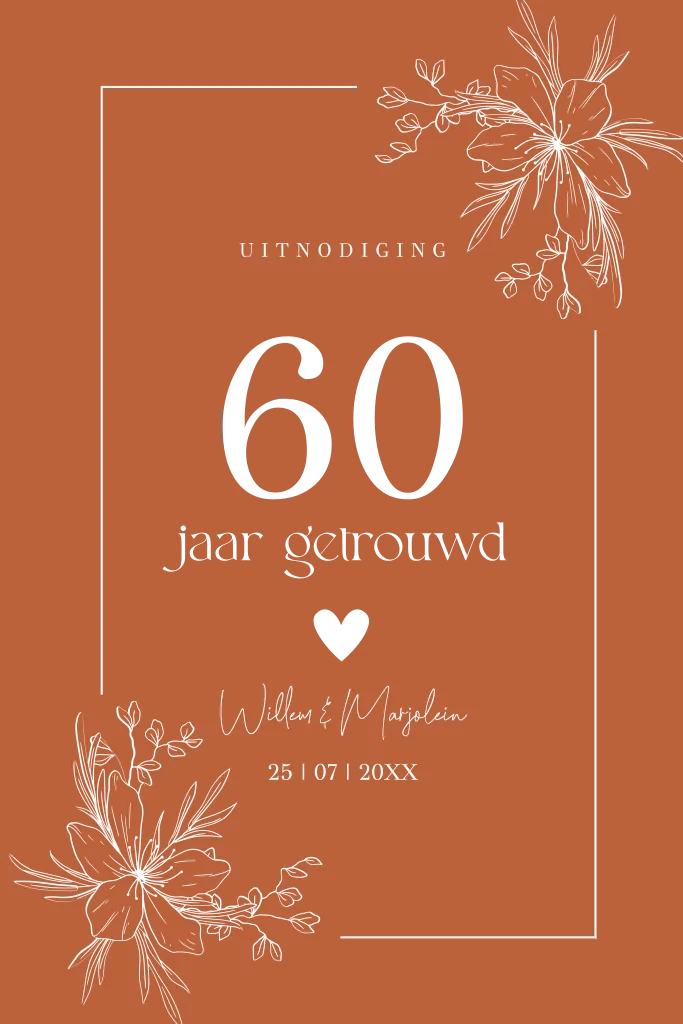 Uitnodiging jubileum 60 jaar getrouwd roestbruin met bloemen kader en goudfolie.