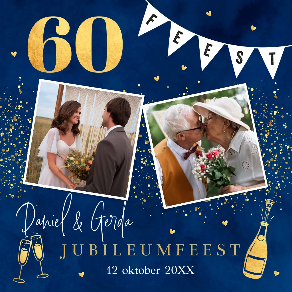 Uitnodiging jubileum huwelijk kaart blauw met eigen foto's, tekst 60 jaar getrouwd en goudlook. Geen folie!